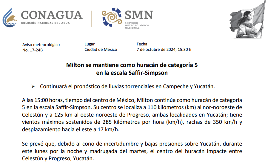 Milton es un Huracán el cual en menos de 24 horas se ha convertido a categoría 5 algo que ha impresionado a los mismos meteorólogos. Milton es entonces catalogado tambien como el huracán mas grande en 20 años. Es por ello que se alerta a la población civil qué extreme precauciones pues no se sabe que tan devastador pueda ser.