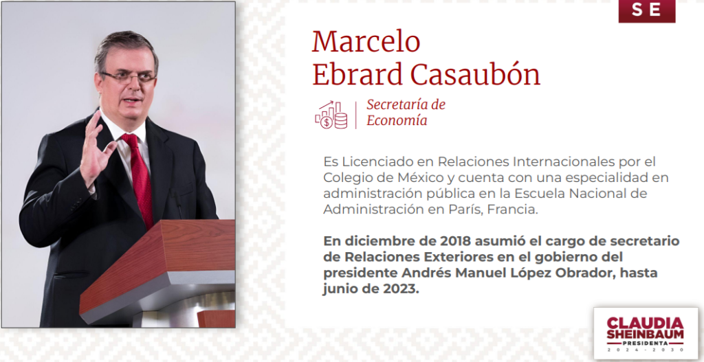 La Dra Claudia Sheinbaum Pardo ya ha elegido a sus primeros secretarios qué la acompañarán en su gobierno. Pues bueno Marcelo Ebrard ha sido elegido como secretario de economía. Algo bastante curioso ya qué su perfil principal son las relaciones públicas. Independientemente de todo ello Marcelo el cual pudo ser nuestro presidente de México simplemente cambiará de cargo pues fué secretario de relaciones exteriores con el presidente Andrés Manuel López Obrador.